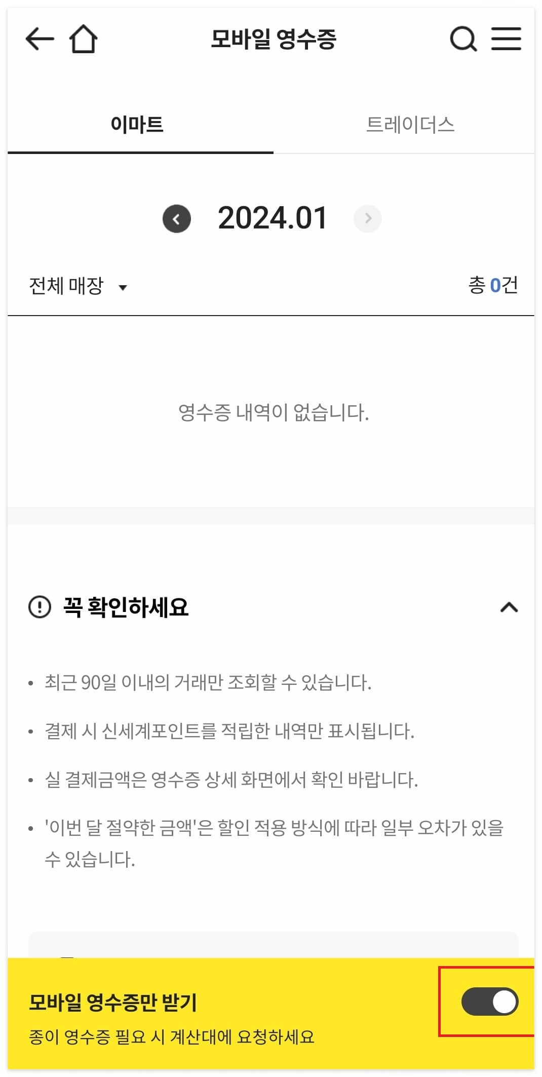 이마트 앱 하단 왼쪽 영수증을 클릭하고 모바일 영수증만 받기를 활성화시키세요. 이제 이마트에서 쇼핑하고 결제하시면 자동으로 전자영수증이 발급되고 100원이 적립됩니다.