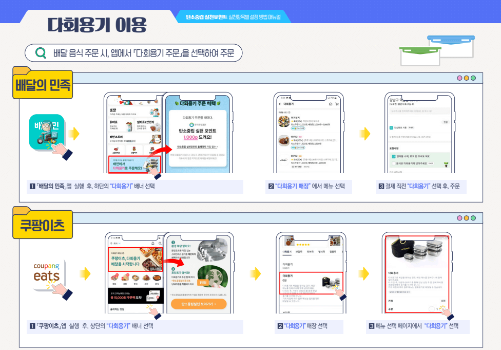 배달음식 시키면 플라스틱용기에 담겨오기 때문에 분리수거할 때 양이 어마어마한 경우가 있어요. 요기요, 배달특급, 배달의 민족, 쿠팡이츠, 땡겨요, 먹깨비, 반들이, 탄탄제로 등의 앱을 이용할 때 다회용기 주문을 하면 1,000원이 적립됩니다.