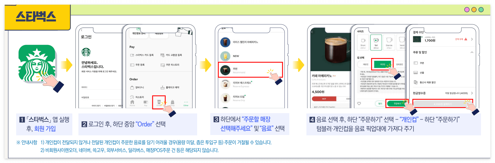 스타벅스는 전자 영수증과 개인컵 사용 시 그리고 리유저블 컵을 반납하면 탄소중립포인트가 적립됩니다.