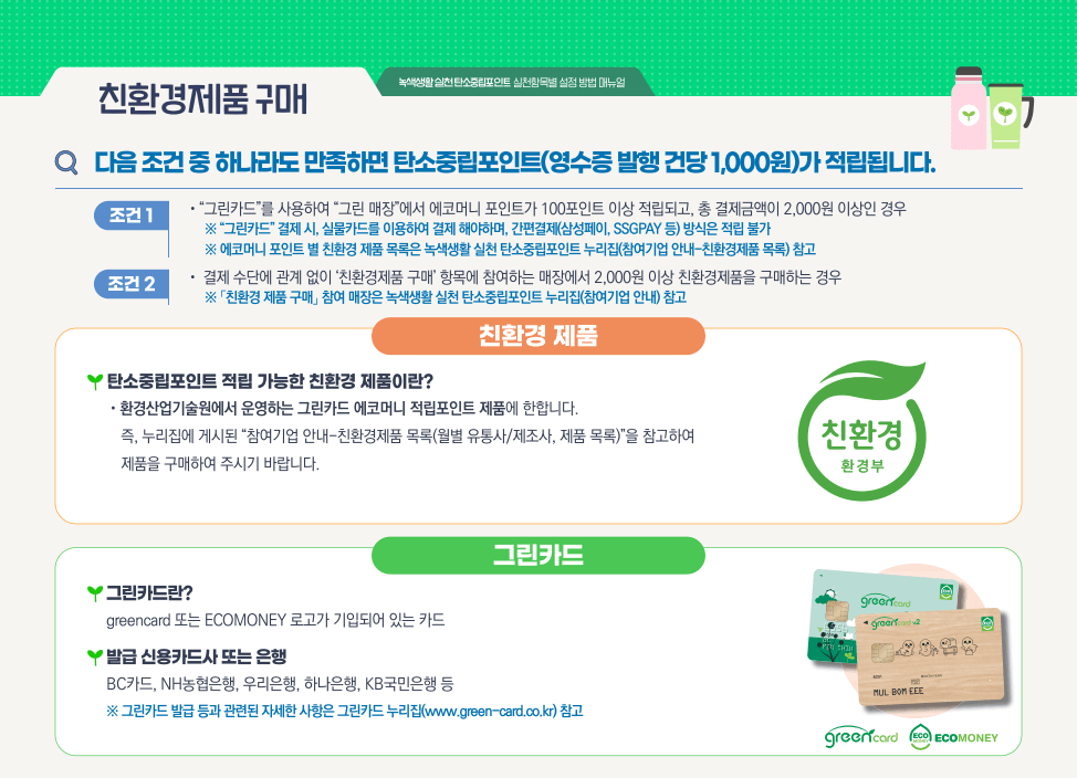 과거에는 그린카드만 이용해야 했지만 지금은 탄소중립포인트에 가입한 후 이마트 등에서 친환경 제품을 구매해도 2,000원 이상 결제하면 1,000원이 적립됩니다.